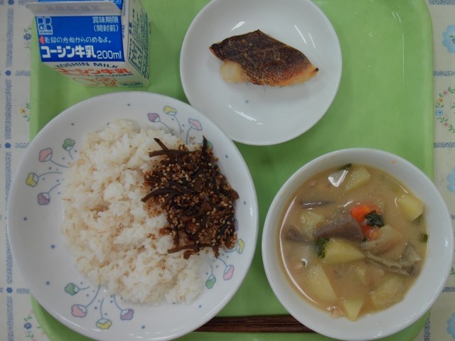 牛乳、ごはん、茎わかめの佃煮、めばるの醤油麹焼き、利休汁