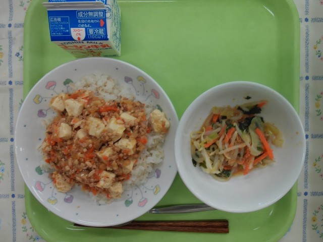 牛乳、マーボー豆腐丼、野菜の中華醤油あえ