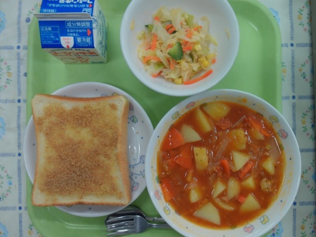 牛乳、セサミトースト、レンズ豆のトマトスープ、フレンチサラダ