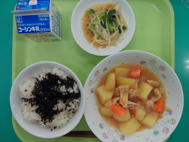 牛乳、ごはん、ピリ辛ふりかけ、五目肉じゃが、野菜の辛子和え