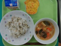 牛乳、高野豆腐のそぼろ丼、ひじきのサラダ、オレンジ