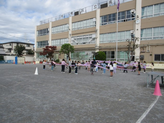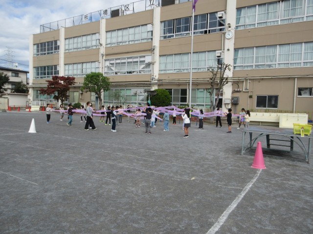 できた作品を校庭で広げていました。