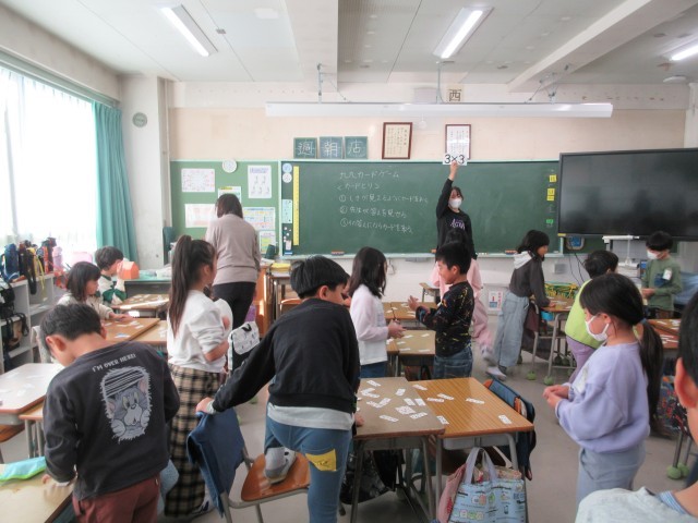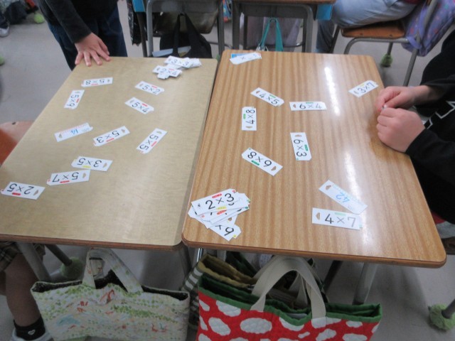 九九カードをばらばらに並べて、先生の問題に答える九九ゲームです。