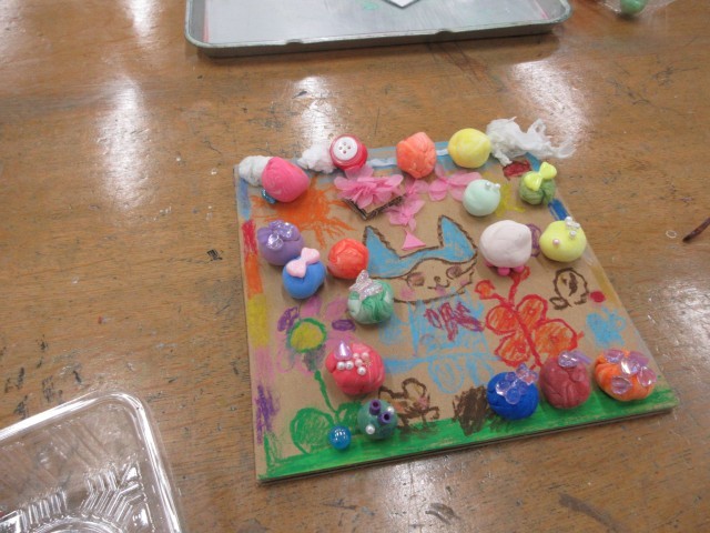 何やら粘土に色を付けて丸めて、楽しそうな作品が出来ていました。