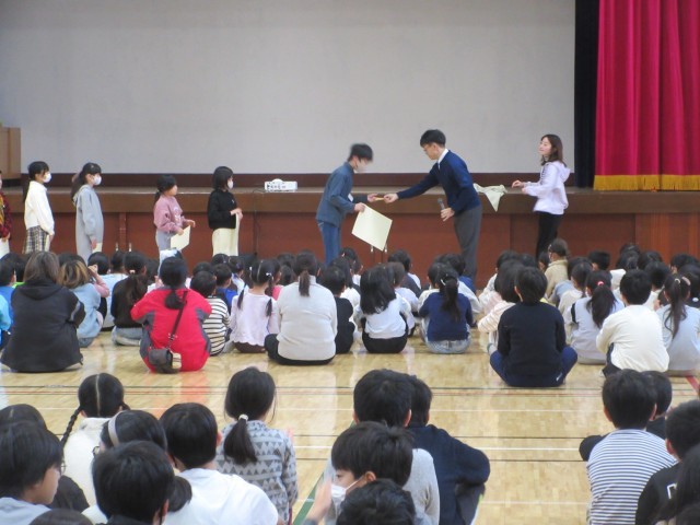 ③読書感想文コンクールの表彰です。みんなよく頑張りました。6年生の1人は、入選で、図書カードもいただきました。