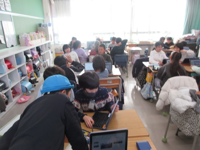 大好きな高島平の魅力を3年生に伝えるためにタブレットや画用紙などにまとめていました。