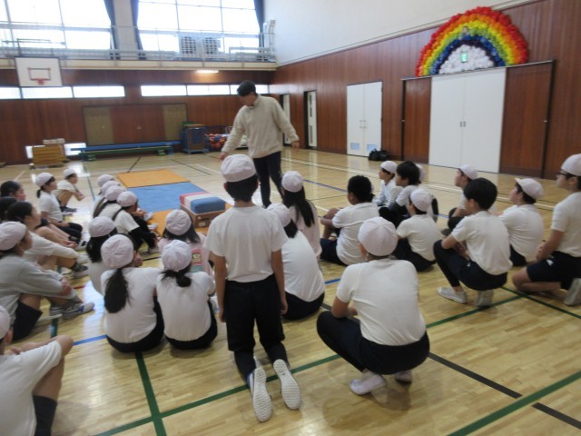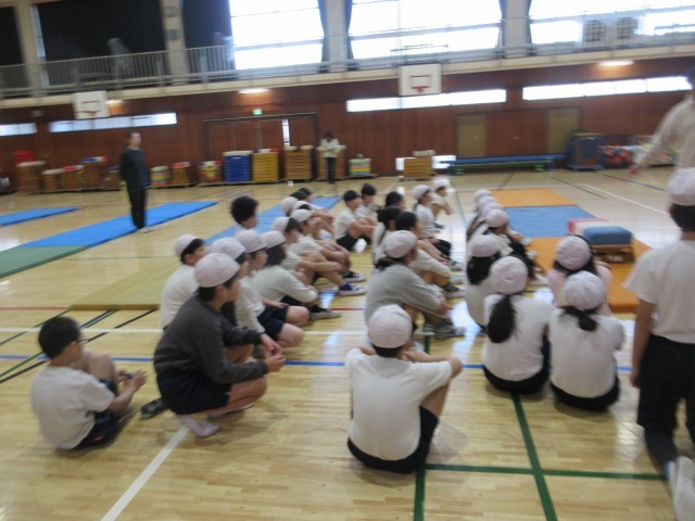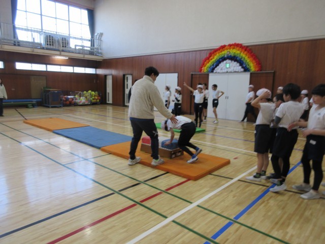担任の先生が台上前転ができるようになるためにスモールステップで授業を組み立てています。