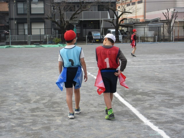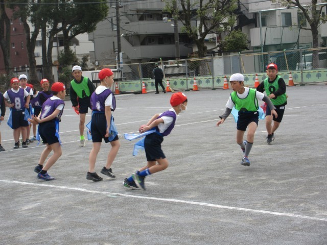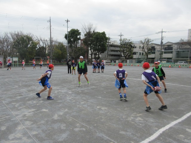 フラッグフットボールの授業を担任の先生と副校長先生と学習しています。
