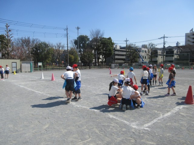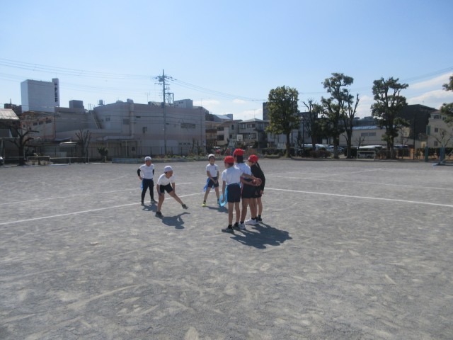 副校長先生、担任の先生とフラッグフットボールの学習です。