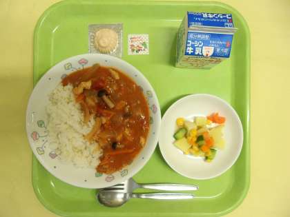 ・チキンストロガノフ&ライス ・さいころサラダ ・いちごレアチーズ(型抜き) ・牛乳