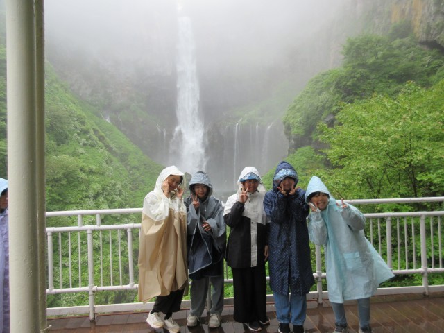 小雨の降る中、華厳の滝を見学しました。雨のおかげでしょうか、滝の水量は豊富でとても迫力がありました。