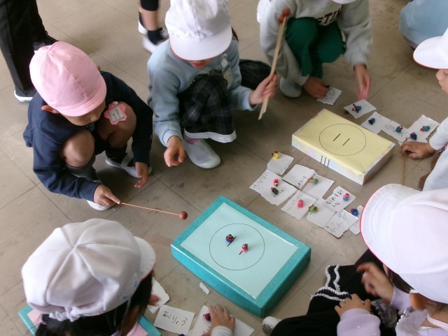 この日のために、秋に拾ったどんぐりや落ち葉を使って遊具やゲームを作りました。