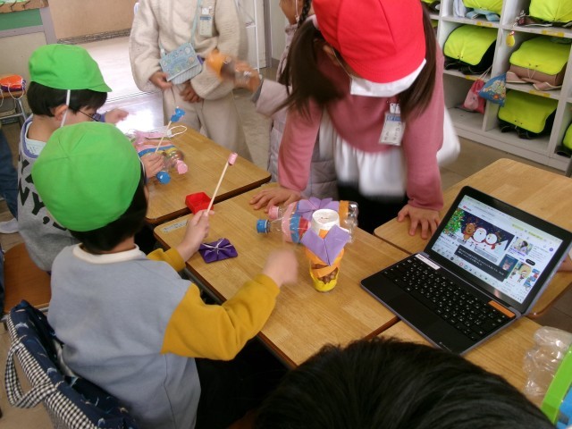 12月22日(月)の3校時間に高島幼稚園と高島平けやき保育園の園児と交流をしました。