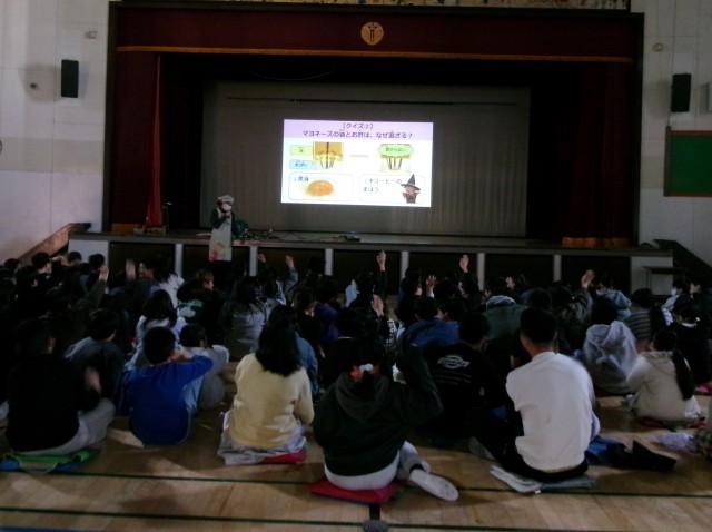 最初に体育館でマヨネーズの秘密についてのクイズに答えたり、マヨネーズがどのように