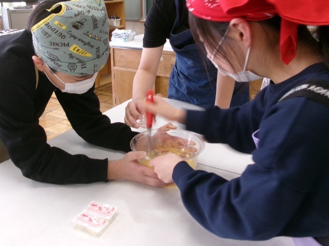 作られるかの動画を見たりしました。その後家庭科室でマヨネーズを作り、自分たちの作った