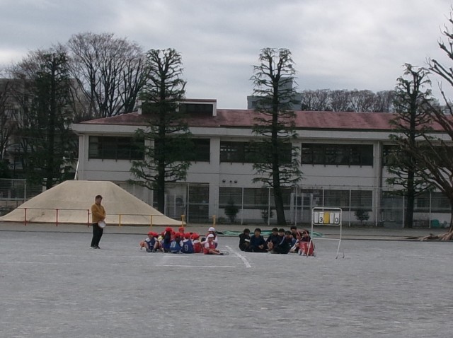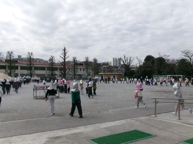 校庭で体育の授業中だったクラスは、校庭の中央に集まってしゃがんで待機していました。