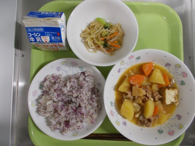 ・ゆかりごはん・豚肉とじゃがいものみそ煮・じゃこサラダ・牛乳