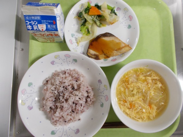 ・古代米ご飯・魚(ぶり)の照り焼き・かぶのレモン和え・えのきと卵のすまし汁・牛乳