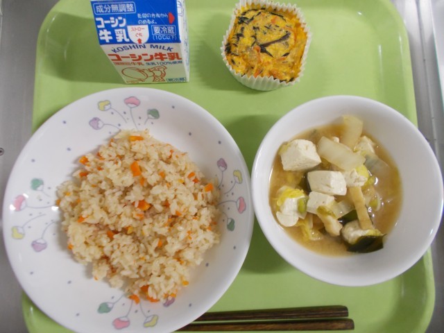 ・もみじごはん・ひじき入り卵焼き・みそ汁・牛乳