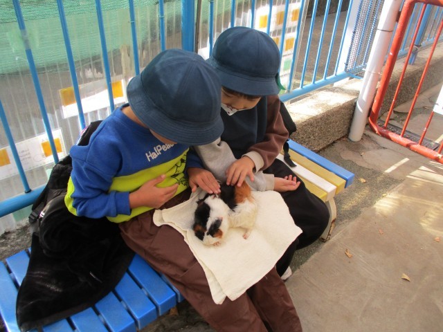 モルモットを膝に乗せたり、ヤギやヒツジとふれあったりして、楽しい時間を過ごしました。