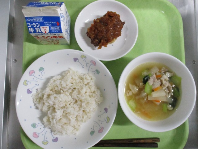 ・ごはん。豆腐入りハンバーグ・大根のぽかぽかスープ・牛乳
