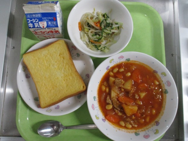 ・フレンチトースト・ポークビーンズ・水菜入りサラダ・牛乳