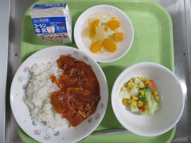 ・きのこストロガノフ&ライス・バジルドレッシングサラダ・くだもの(フルーツジュレ)・牛乳