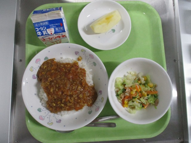 ・キーマカレー・コールスロー・くだもの(りんご)・牛乳