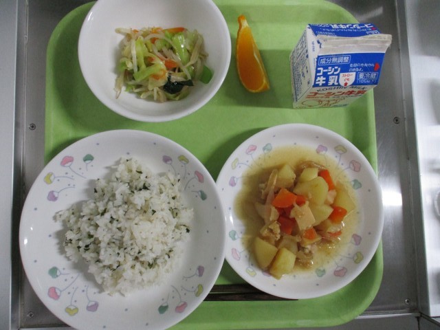 ・わかめごはん・五目肉じゃが・野菜の辛子和え・くだもの(デコポン)・牛乳