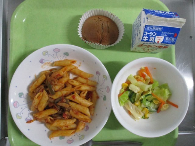 ・ペンネアラビアータ・イタリアンドレッシングサラダ・ココアケーキ・牛乳