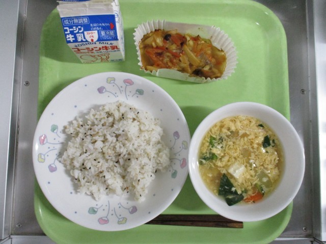 ・ごまごはん・魚(鮭)のちゃんちゃん焼き・かきたま汁・牛乳