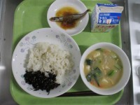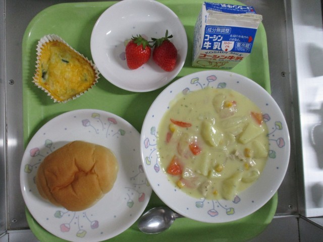 ・ショートニングパン・きのこのキッシュ・米粉のシチュー・くだもの(いちご)・牛乳