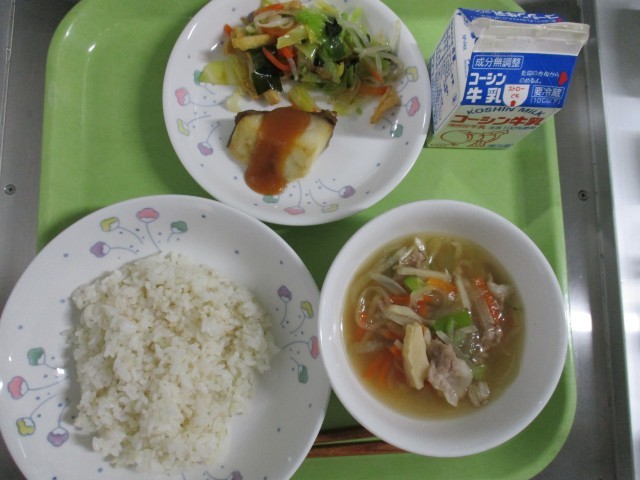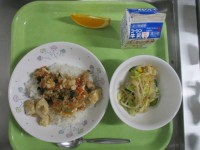 ・ごはん・魚(沖めだい)のみそだれがけ・カリカリ油揚げのサラダ・さわにわん・牛乳