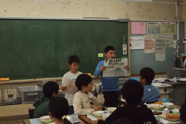 給食の時間に子どもたちが1年生から6年生の教室に行き、ポスターを持って呼びかけてきました。