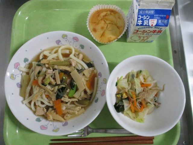 ・山菜うどん・ツナとわかめのサラダ・ヨーグルトケーキ・牛乳
