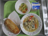 ・ショートニングパン・きのこのキッシュ・米粉のシチュー・くだもの(いちご)・牛乳