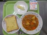 ガーリックトースト・レンズ豆のシチュー・りんご・牛乳 食パンににんにくのすり...