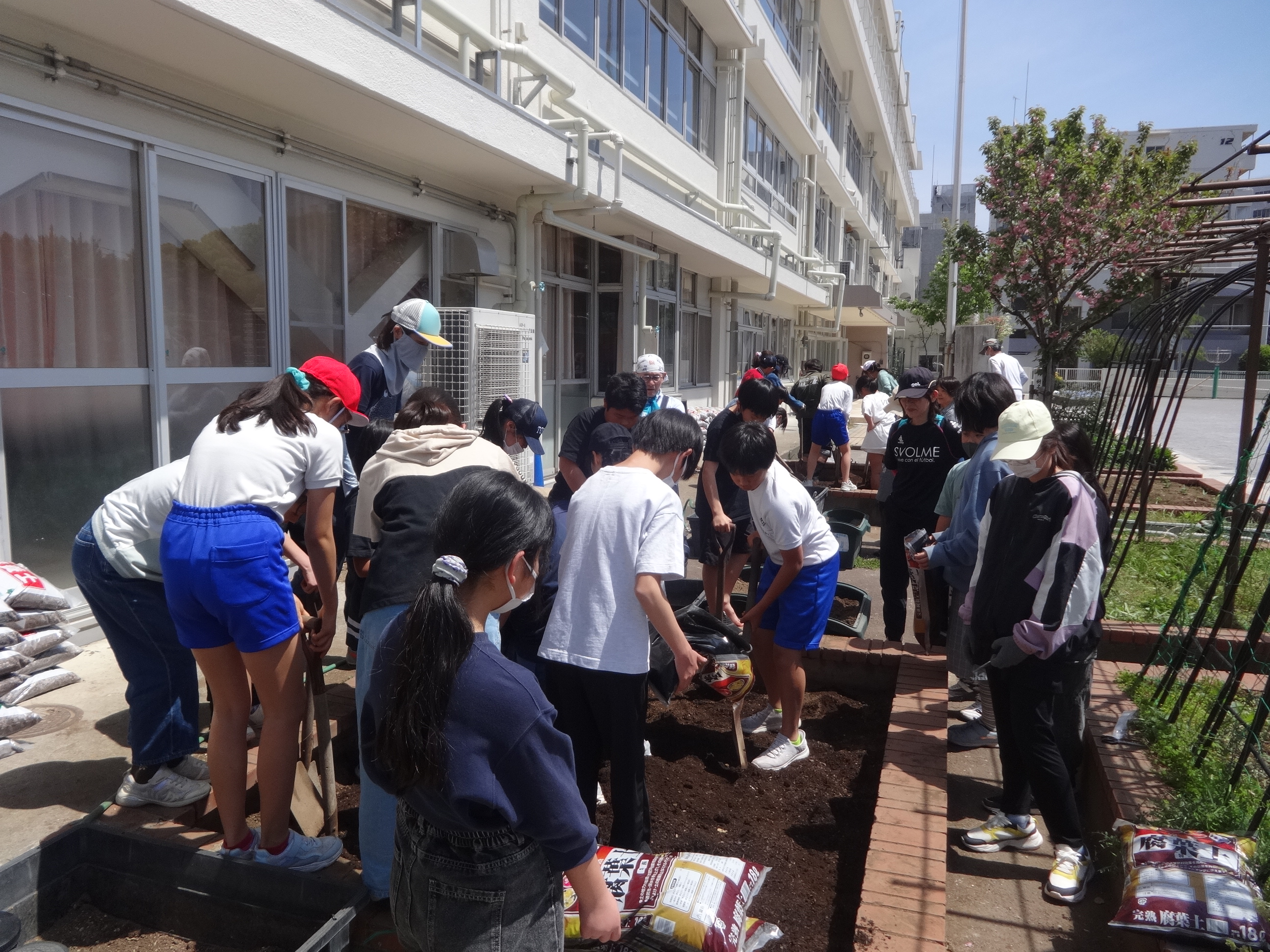 学校支援地域本部の方やボランティアの方々にご協力いただき、適した分量の土を配合していきます。子どもたちは、重い袋を運んだり、土をスコップで混ぜたりと、汗をかきながら一生懸命に作業をしました。