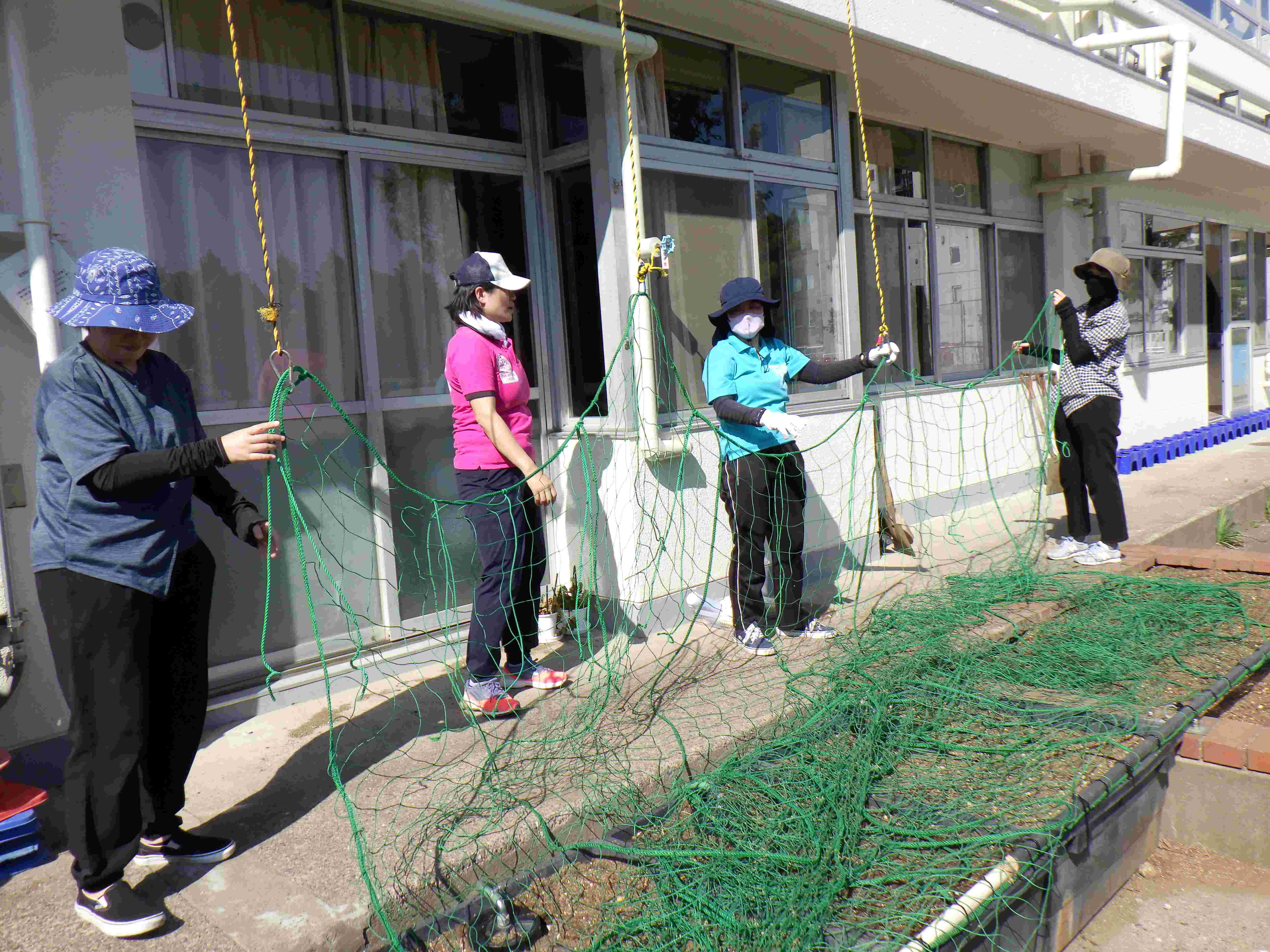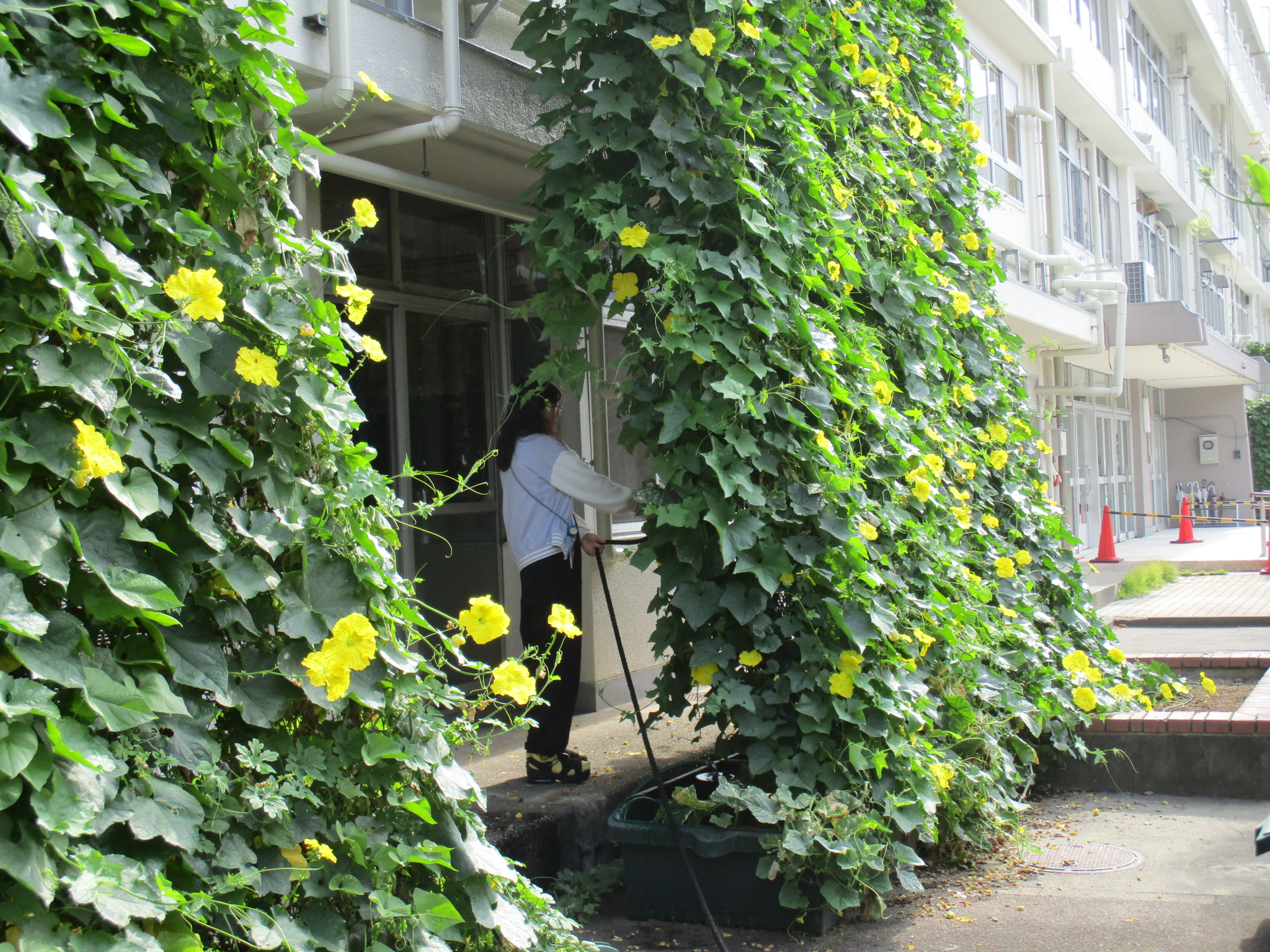 放課後、学校支援地域本部の方と教職員とで、グリーンカーテンのネット張りの作業を行いました。花壇にネットをしっかりと固定し、4階のベランダまで引き上げていきました。今年も、大きく育ってくれることを願っています。