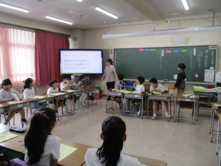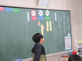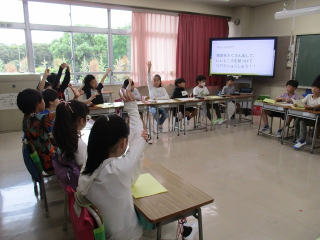 4年生が、クラス目標について学級活動を行いました。司会者が、なるべく多くの意見を引き出すために「周りの人と話し合ってもいいです。」と促したり、出てきた意見を比べたりまとめたりしながら、話し合いを上手に進めていました。