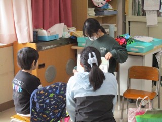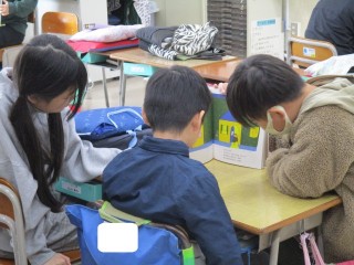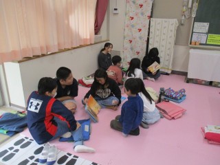 読書週間の最終日、6年生が1年生のために選んだ本を持って教室へ行き、読み聞かせをしました。普段から仲良く遊んでくれている6年生ですが、今日はじっくりと落ち着いた雰囲気で、1年生にも分かりやすく絵本を読んでくれました。1年生も、真剣に聞き入っていました。