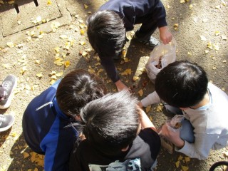 1年生は、生活科「あきまつりをしよう」の学習で、おもちゃづくりの材料を集めに出かけました。旧高七小周辺の歩道や赤塚公園で、きれいな落ち葉やどんぐりを夢中になって探しました。真っ赤な桜の木の落ち葉をかざしながら、「やきいもみたい!」「ほんとだ!」と、皆で楽しみながら秋を満喫してきました。