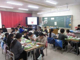 3年生では、「板橋の農家さんから、板橋の野菜作りについて話を聞こう!」をテーマに授業を行いました。板橋ふれあい農園会より生産者の方をお招きし、板橋の農業の特色や野菜作りをするうえでのご苦労や喜び等について教えていただきました。朝は3時半に起きて畑へ向かわれると聞き、子どもたちは驚いていました。授業後の給食は、生産者さんや区役所の皆さんと一緒にいただきました。「板橋産大根の煮物」をいつも以上に感謝の気持ちをもって、味わいながらいただきました。