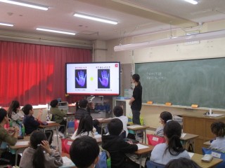 3年生は、学級活動の時間に手洗いの方法について学びました。いつも通り洗った手にブラックライトを当てて観察すると、爪の周りや手首、指の間などに洗い残しが見られました。健康のために、汚れをしっかり落とす丁寧な洗い方を、皆で実践していきましょう。