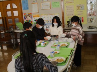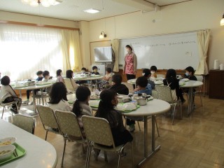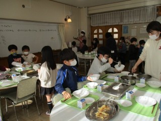 1年生が、初めてのランチルーム給食を行いました。各テーブルに食缶が用意され、班で協力ながら配膳をしていきます。教室とは違った素敵な雰囲気の中、少し背筋を伸ばしながら楽しい気分でいただきました。