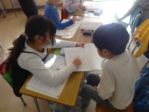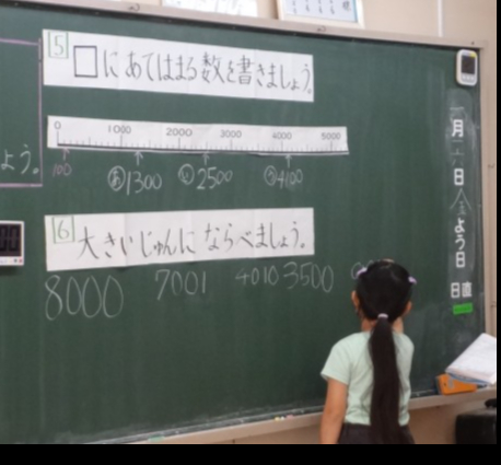 2年生の算数「1000より大きな数」の単元において、研究授業を行いました。スマイルタイム(自分で問題について考え、解決する時間)をとったあと、自分の考えを生き生きと友達に説明していました。学習コーナーのヒントカードや道具を使って考えたり、自分の考えを説明したり、友達の考えを聞いたりしながら、学びを深めていました。