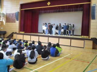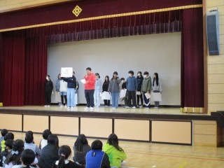 今月の全校昼会は、「なかよし班まつり」のお店紹介でした。「キョウシツカラノ ダッシュツ」「しょうがいぶつきょうそう」「たからだるま」「暗やみ宝さがし」・・・バラエティに富んだお店がありました。6年生のリーダーを中心に、準備を進めているところです。当日が楽しみです。