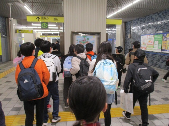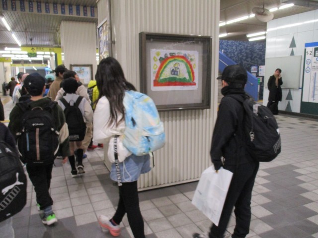 みどりの学びのエリア(三園小学校・高島第三小学校・高島第三中学校・高島第五小学校)のCS委員会主催で、高島平駅・新高島平駅・西高島平駅の3駅で作品展示を行っています。写真は、社会科校外学習の帰りの5年生が、高島平駅校内に展示された作品を鑑賞しているところです。期間中、ぜひお立ち寄りください。