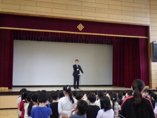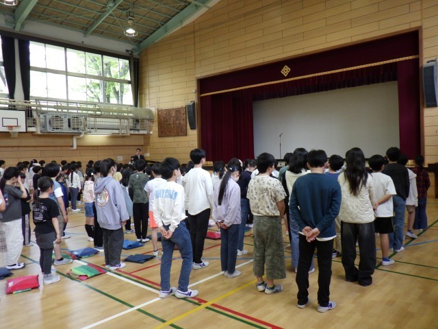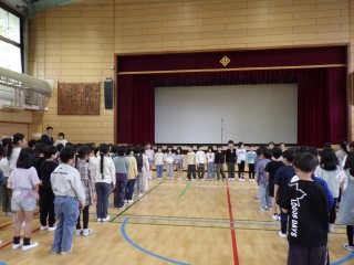 今年度初めての「全校昼会」では、新しく着任した副校長先生の自己紹介とお話がありました。子どもたちは新しい先生との出会いに興味津々な様子で、真剣に耳を傾けていました。また、日直の先生からは4月の目標「進んであいさつをしよう」が伝えられました。気持ちの良い挨拶が校内に溢れるよう、皆で意識を高める良い機会となりました。