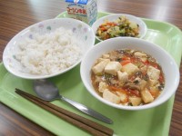 【本日のメニュー】ごはん、四川豆腐、海藻サラダ、牛乳、*2月誕生日の人にゼリー提...